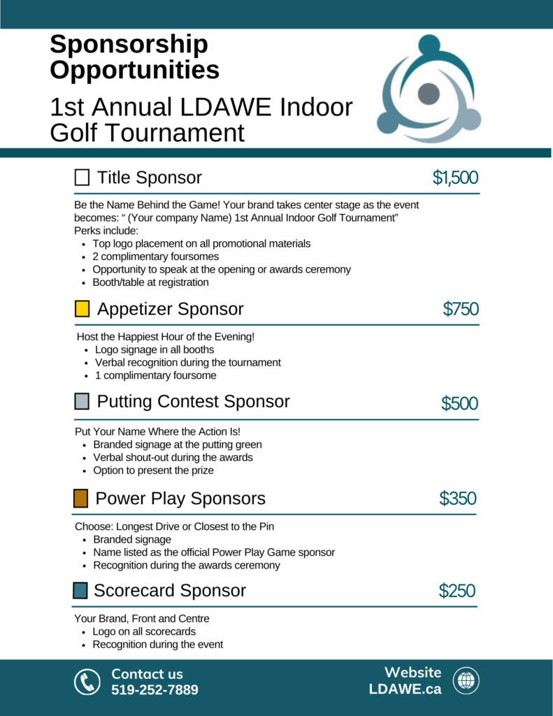 To download a flyer: https://www.ldawe.ca/wp-content/uploads/2026/01/2026-Indoor-Golf-Tournament.pdf
